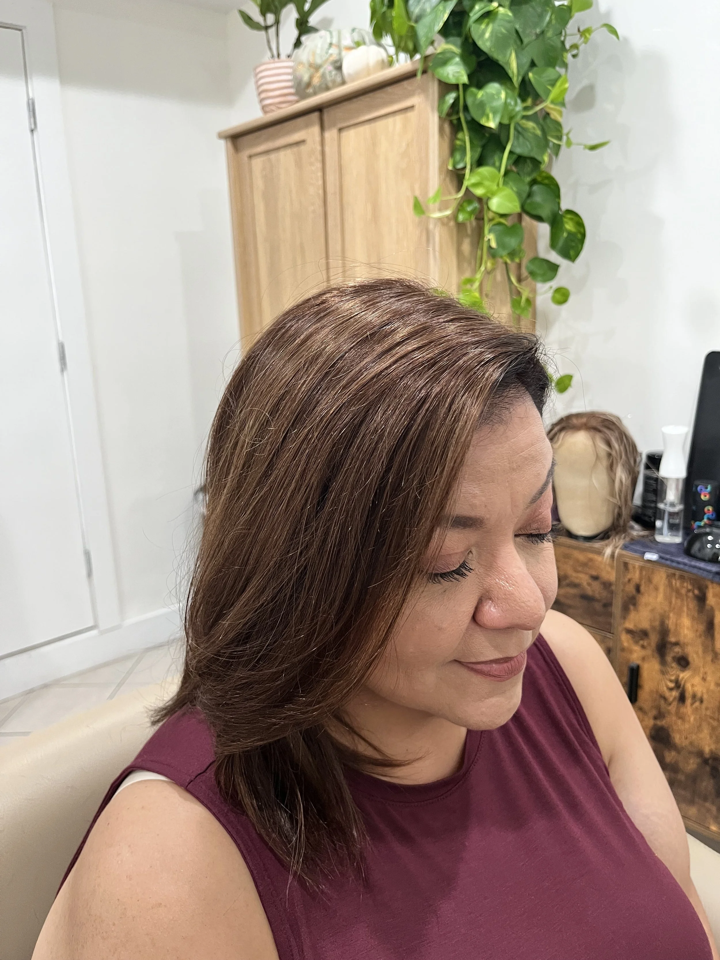 There are many types of toppers available. Some offer light coverage to enhance your part, while others provide more extensive coverage. Pricing varies depending on factors like hair quality, length, size, and construction, but we believe in complete transparency. During your consultation, you’ll receive a clear, exact quote with no hidden fees or unexpected costs.